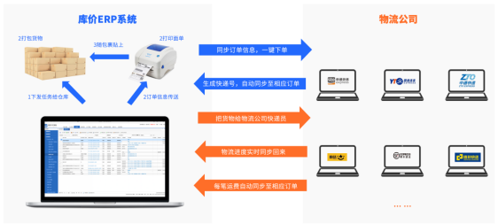 ERP系統下發任務給倉庫,打包貨物的同時進行快遞面單打印,做到貨、單同步;一鍵下單,ERP系統內的訂單信息直接同步到第三方物流軟件;生成的快遞號自動同步回ERP系統相應訂單上;然后快遞員來取走貨物進行運輸,物流進度會實時從第三方物流軟件同步回ERP系統;對應的每筆運費也會同步回相應訂單。