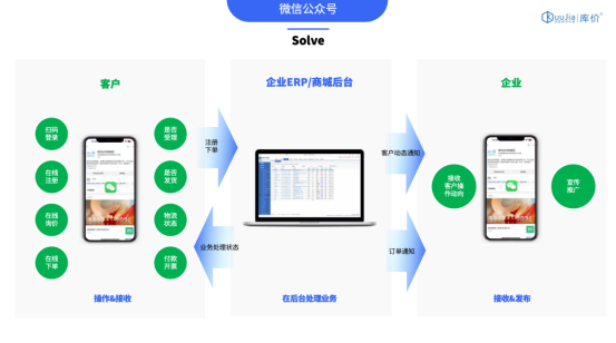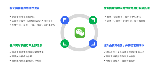 客戶微信掃碼登錄商城網站,可完成注冊會員、在線詢價、提交訂單等操作;對接后通過微信公眾號即時推送訂單受理、發貨、物流、開票及付款等消息;企業建設微信公眾號并對接商城網站,管理者授權登錄可掌握業務動態,及時處理客戶需求;通過微信公眾號精準推廣網站,推送產品、活動等內容,利用互動功能及菜單設置引導用戶購買。