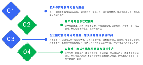 對于新客戶,企業無法第一時間知曉客戶在線發起的溝通,沒有及時響應,無法維護住新增注冊會員;對于老客戶,沒有第一時間處理訂單,錯失商機的同時引起客戶不滿,不利于客源積累和企業聲譽